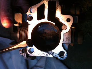 I was amazed the thing ran at all. It became pretty obvious that the butterfly was not closing securely. So we proceeded to clean it up. A little brake fluid cleaner and a stiff toothbrush made short work of the majority of it.