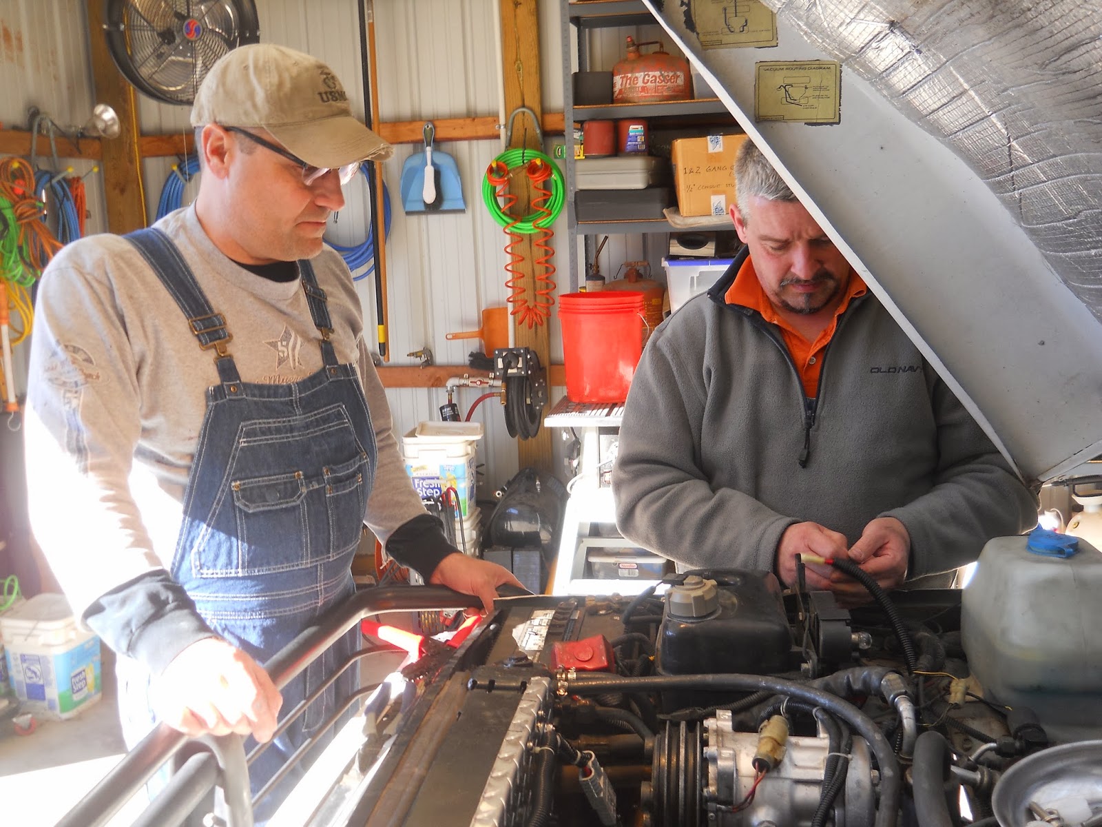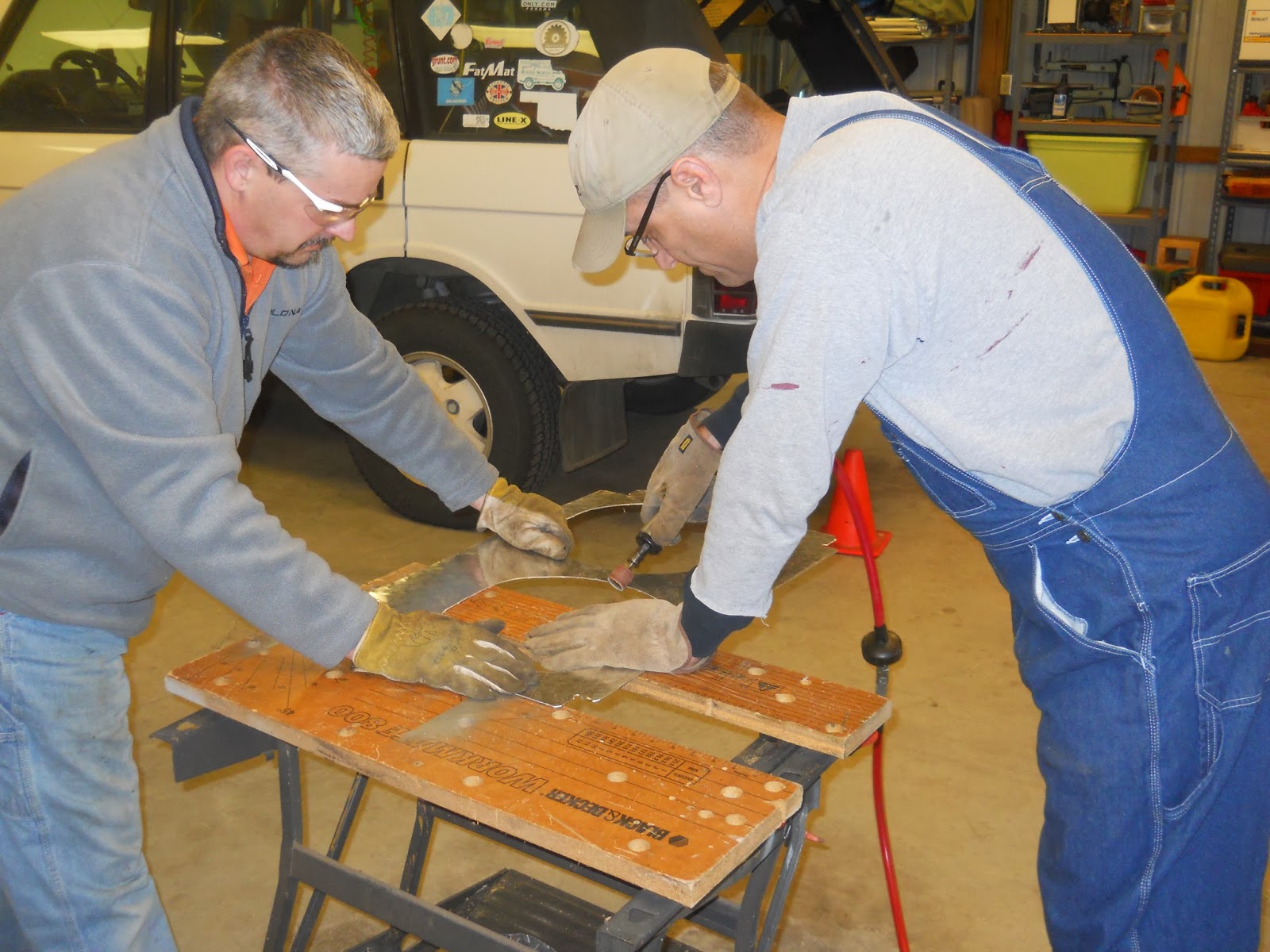 This project started at 0930 and didn’t get wrapped up until 1830. We took three breaks, one for breakfast, one for lunch, and one to weld up the exhaust leak. Butch and I mostly watched the whirlwind that is the Evil German Dude. It is his shop and only he knows where all the entrances to his secret earthquake generation lab tools are located. Overalls are not required but highly recommended. Two of the three of us (the smarter ones) were wearing them. So sit back and put on your reading glasses, you are going to need them for this one.