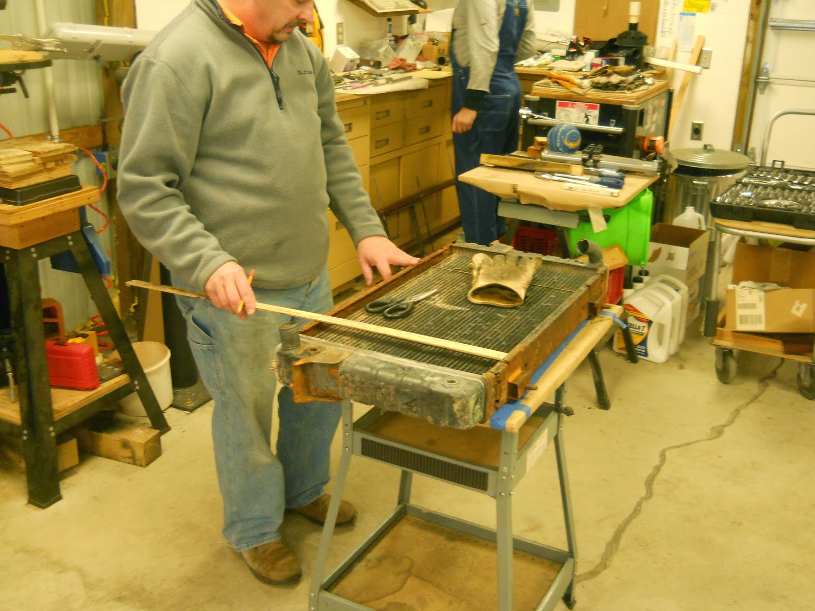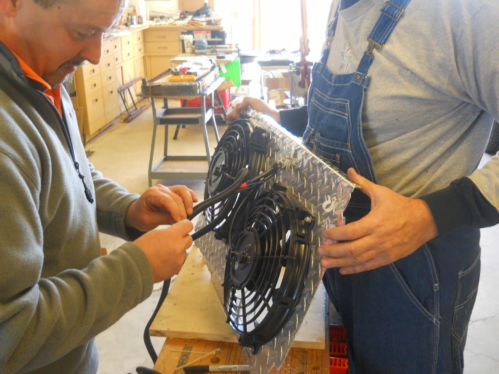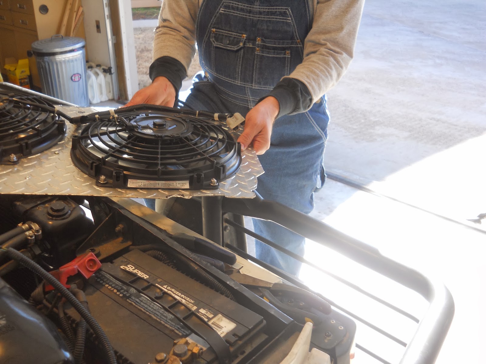 EGD and I had a planning meeting before we started. We looked at my extra radiator and took some measurements to determine fan size. We chose two 12 inch fans as we determined they would fit well on the radiator.