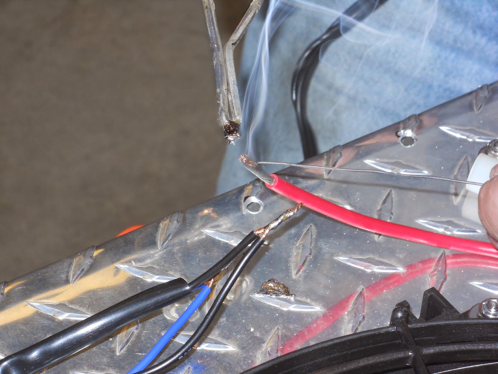 While I was demo-ing the canister. EGD and Paparazzi wired up the fans. The kit contains a wiring diagram. EGD had done this job twice before, once on his Chevy pickup truck and once on Paparazzi’s Chevy Blazer. He started wiring and soldering and such. This is a good time to say that every wire was shrouded in wire loom. Wires are not to be left without some sort of protection.