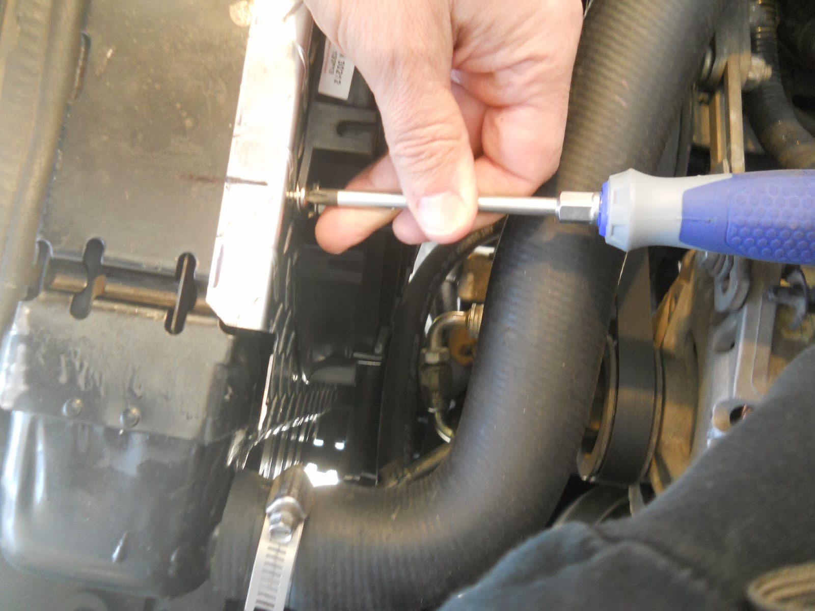 Screwing the shroud to the radiator.