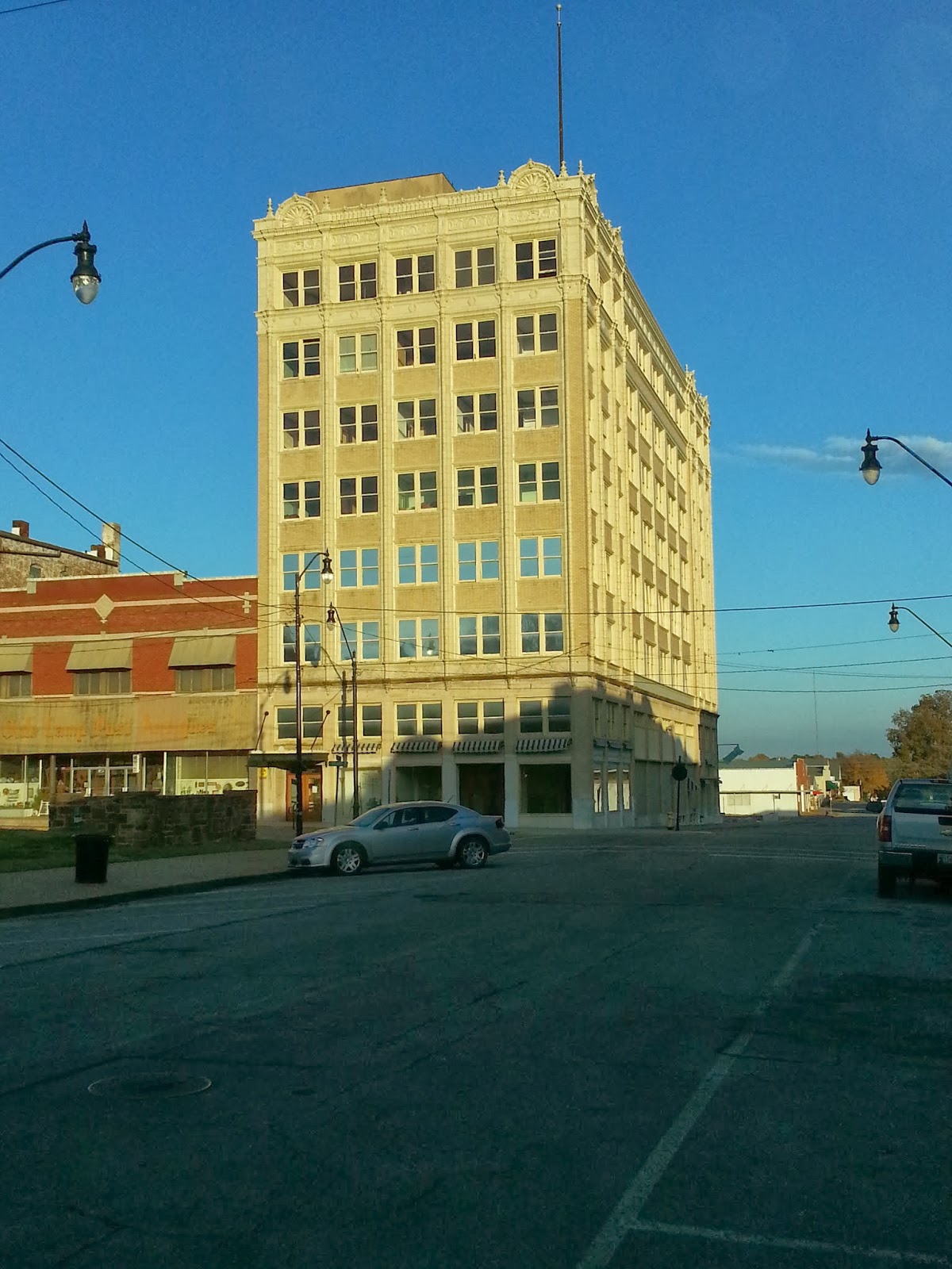 The Commerce Building, Okmulgee’s Skycraper, was built by the Commerce Investment Company in 1921. It has seen many tenants over time. According to one website it is being renovated. From looking in the windows I could see something had started. I think it would make a really great place to have an apartment.