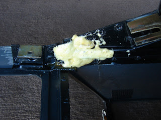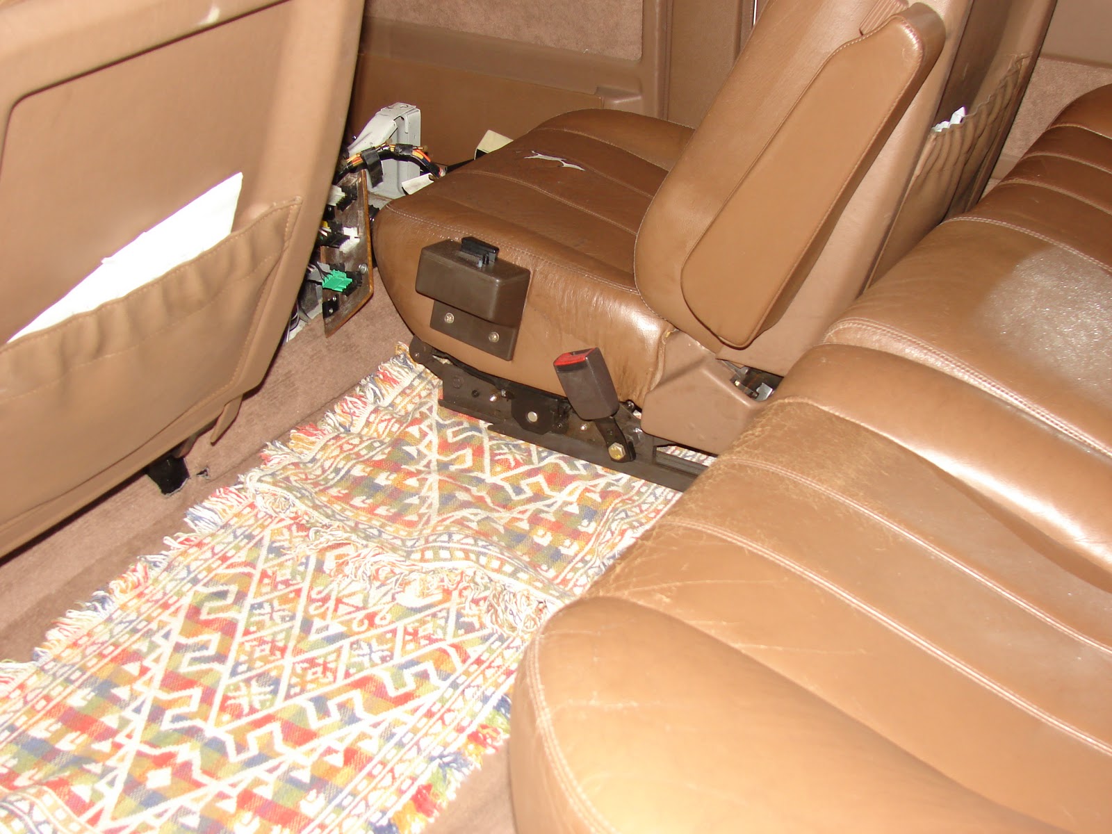 You can see in this picture that I have the passenger seat unbolted, that is to have it out of the way for the floor board welding. I am not sure what the white area is on the middle of the rear seat. This picture was taken before I cleaned everything and conditioned it.