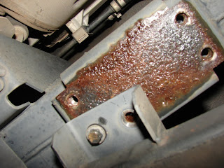 This is not good. And it was badly coroded. I ran the wire brush and a wire wheel on a drill across it as much as I could. I then sprayed it with brake cleaner on the under side. On the beam I washed the brushed part with alcohol and then on both I used the air to dry them.