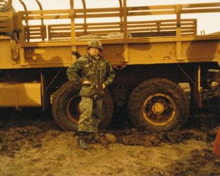 Trust me when I say, that truck weren’t going no where but down the more we let the wheels spin. And for the record, we were ordered to drive down there. You can tell this was a generation ago, from the old school poplin BDUs and the World War 2 style helmets we used to wear. Good times, good times.